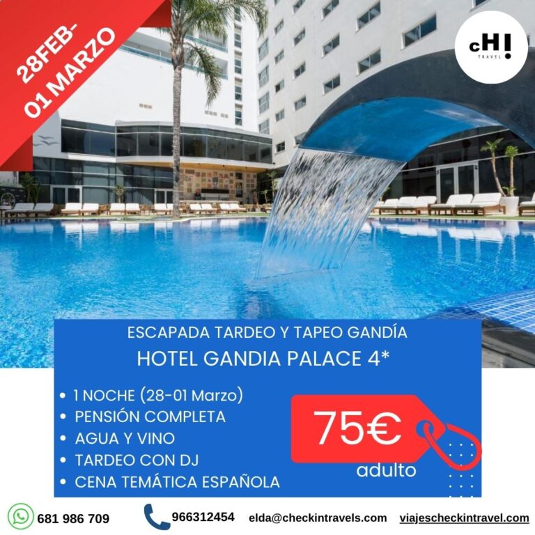 OFERTON TARDEO Y TAPEO EN GANDIA FEBRERO 10/16/2025 𝐇. 𝐆𝐚𝐧𝐝𝐢𝐚 𝐏𝐚𝐥𝐚𝐜𝐞 𝟒* (Playa de Gandía) 𝟐𝟖-𝟎𝟏 𝐌𝐚𝐫𝐳𝐨 (𝟏 𝐧𝐨𝐜𝐡𝐞) Ver oferta